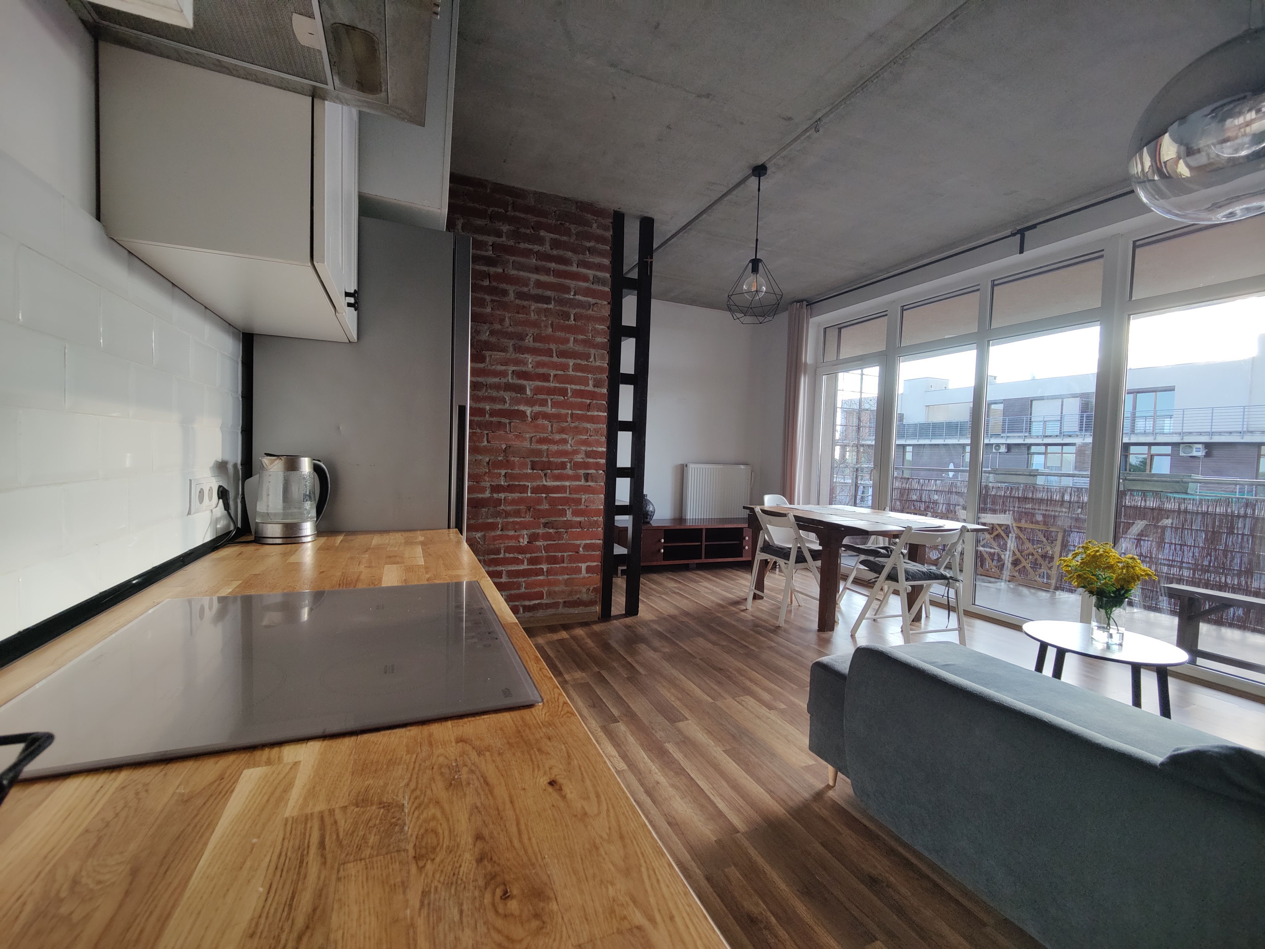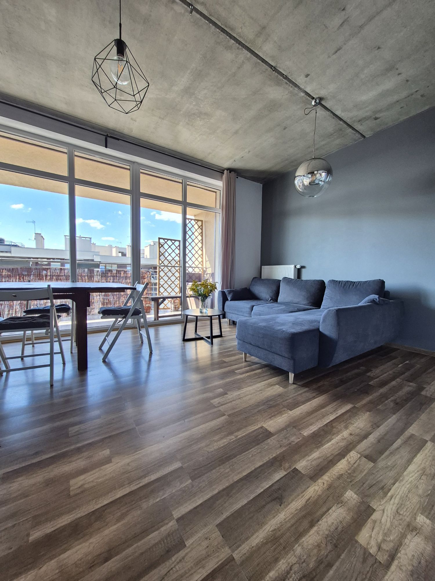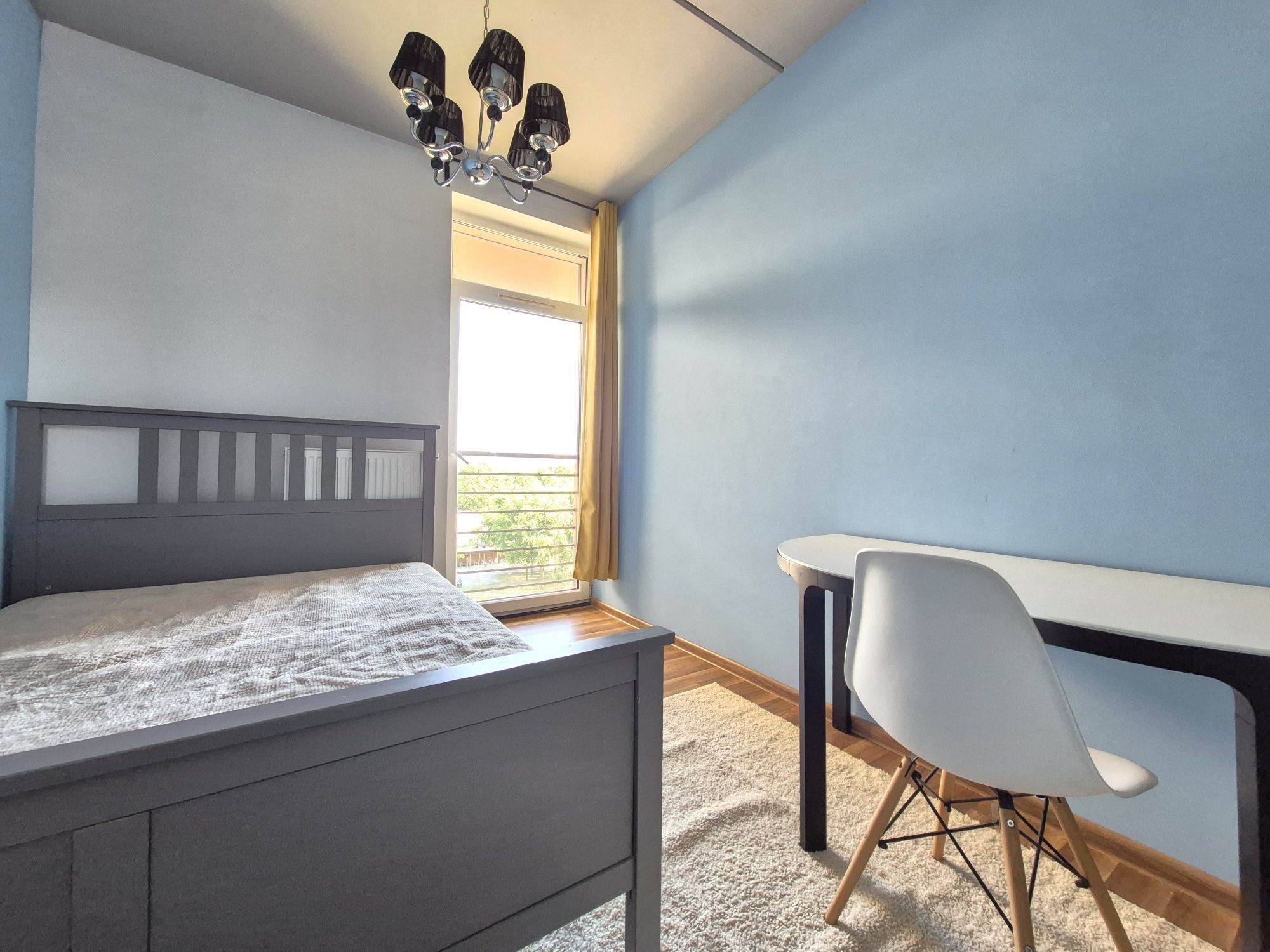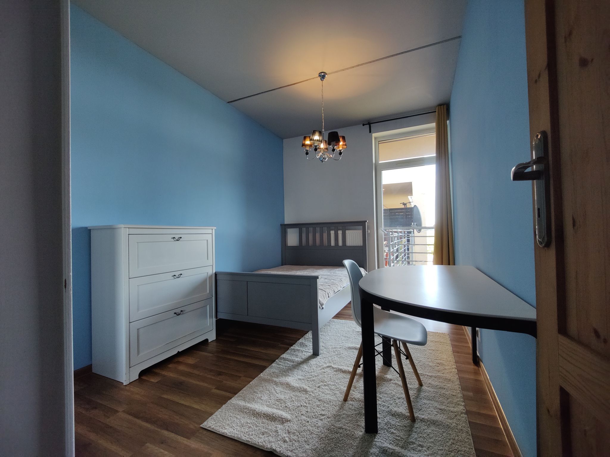 Mieszkanie składa się z dużego pokoju z aneksem kuchennym (ok. 26 mkw.) z wyjściem na duży balkon (8 mkw.) z wnęką do własnego zagospodarowania, przedpokoju, łazienki z wanną i wc (4,7 mkw.) oraz sypialni (ok. 12 mkw.).